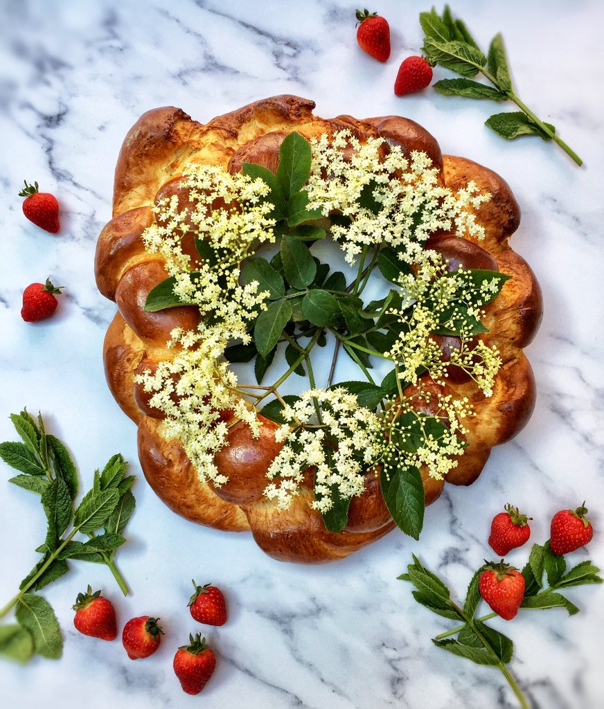 - 5. Once the elderflower challah dough has risen, knock it back and place on a lightly floured surface to shape. Roll the dough out long, thin and flat using a rolling pin and then cut 4 long strips out of the dough and shape into a 4 strand round braid. Once shaped, leave the challah dough to rise again under a clean cloth or cling film. Once risen again, egg wash the challah dough using egg white (for a lighter, matte finish) and then bake in the oven at 180 degrees C / 350 degrees F for 30 minutes at the bottom of the oven.