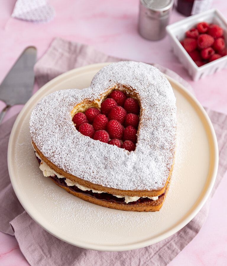 Valentine’s Victoria Sponge with Raspberries A small change to this classic cake makes it perfect for Valentine’s Day, or any day you want to spread a little bit of love. A classic Victoria sponge flavoured with vanilla, a generous amount of raspberry jam, lightly sweetened whipped cream and a fe